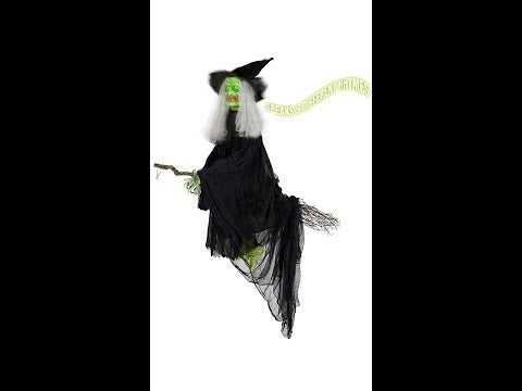 Diese Horror-Dekoration hat eine Größe von 155 cm und besteht aus einer Hexe, die auf einem Besen fliegt. Die Augen der Hexe leuchten in der Farbe Grün und sie bewegt ihren Kopf. Die Animationen werden durch einen Tonsensor aktiviert. Diese gruselige, batteriebetriebene Dekoration eignet sich ideal für Halloween oder andere Veranstaltungen.