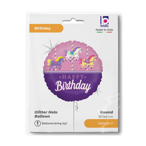 Vollständige Details anzeigenABC18 Folienballon "Happy Birthday Karussellpferdchen" Holo | Ø 46 cm