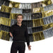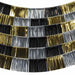 Der Satz besteht aus 6 einzelnen Metallic-Fransenbändern in den Farben Schwarz, Gold und Silber, die zusammen eine komplette Kulisse bilden. Jedes Band misst 150 x 26 cm und kann flexibel aufgehängt, kombiniert oder nach Belieben arrangiert werden. Die Metallic-Oberfläche der Fransen reflektiert das Licht auf elegante Weise und sorgt für ein strahlendes, glanzvolles Ambiente.