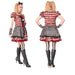 Das Kostüm besteht aus einem verspielten Harlekin-Kleid mit klassischen Rautenmuster-Elementen, Puffärmeln und einem weit schwingenden Rock. Farblich dominiert eine Kombination aus Schwarz, Weiß und kräftigem Rot – ein Mix aus Eleganz und Wahnsinn. Passend dazu erhalten Sie einen Haarreif mit großer Schleife, ein Halsband mit Knopf-Detail sowie Handschuhe, die den Look perfekt abrunden.