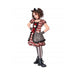 Das Kostüm besteht aus einem verspielten Harlekin-Kleid mit klassischen Rautenmuster-Elementen, Puffärmeln und einem weit schwingenden Rock. Farblich dominiert eine Kombination aus Schwarz, Weiß und kräftigem Rot – ein Mix aus Eleganz und Wahnsinn. Passend dazu erhalten Sie einen Haarreif mit großer Schleife, ein Halsband mit Knopf-Detail sowie Handschuhe, die den Look perfekt abrunden.
