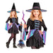 Das 2-teilige Set besteht aus einem auffälligen Hexenkleid und einem klassischen, spitzen Hexenhut. Das Kleid ist aus leicht glänzendem Stoff gefertigt und besticht durch viele liebevolle Details: bunte Ärmel, ein mehrlagiger Rock mit Glitzereffekten und verspielte Farbakzente machen es zu einem echten Blickfang. Der Rock fällt locker und bietet viel Bewegungsfreiheit – perfekt zum Tanzen, Toben und Zaubern!