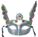 Die Maske besteht aus Kunststoffmaterial und wurde mit glitzernden Ornamenten und vielen bunten Pailletten besetzt. Sie wird mit einem schmalen Satinband am Hinterkopf gebunden.