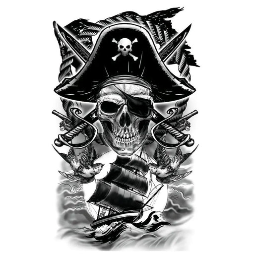 Setz die Segel in Richtung Grusel-Party – mit dem Halloween Tattoo Pirat im großflächigen Format von 14 x 30 cm! Dieses temporäre Tattoo ist der id...