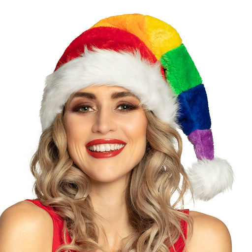 Die Kopfbedeckung Santa Claus ist in den Regenbogenfarben Rot, Orange, Gelb, Grün, Blau und Lila gestreift. Um den Kopf herum ist die Mütze mit ein...