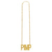 Setze ein unverwechselbares Statement mit der stylischen Halskette „Pimp“! Dieser auffällige Modeschmuck ist das perfekte Accessoire für alle, die ihren Look auf das nächste Level heben und beim Party- oder Clubbesuch glänzen wollen. Die Halskette ist in einem strahlenden Goldton gehalten und zieht sofort alle Blicke auf sich. Besonders das Highlight: der Anhänger in der Form des Schriftzugs „Pimp“, der mit zahlreichen kleinen Schmucksteinen besetzt ist. Diese funkelnden Details sorgen dafür, dass der Anhänger im Licht jeder Party wunderschön glitzert und ein echter Eyecatcher wird.