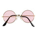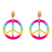 Das Set enthält ein weißes Blumen-Stirnband, eine rosa Lennon-Partybrille mit goldenem Gestell, bunte Ohrringe sowie eine Peace-Halskette in Regenbogenfarben aus Kunststoff. Die farbenfrohen Accessoires sorgen sofort für gute Laune und einen authentischen Retro-Look.