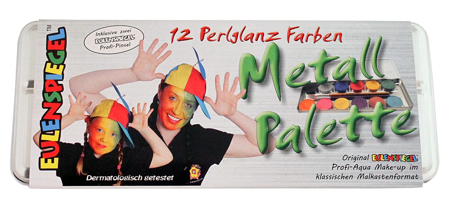 Profi Schminkpalette von Eulenspiegel mit 12 tollen und sehr ergiebigen Farben auf Wasserbasis und zwei Profi-Pinseln. Die Farben sind frei von Parfümstoffen. Lieferumfang: - 12 Perlglanz-Farben á 3,5 ml - 1 Schminkpinsel Größe 3 - 1 Schminkpinsel Größe 4